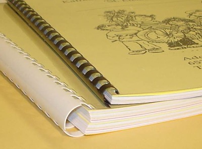 Bei dieser Bindung werden Löcher in das Papier gestanzt. Ein Foliendeckblatt und ein ledergenarbter Karton werden in eine Plastikspirale gebunden.