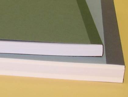 Bei der Leimbindung wird eine Foliendeckblatt und ein ledergenarbter Karton als Endblatt in einen Leimstreifen gebunden. Wahlweise kann anstatt ein Foliendeckblatt auch ein weitere Karton mit eingebunden werden.